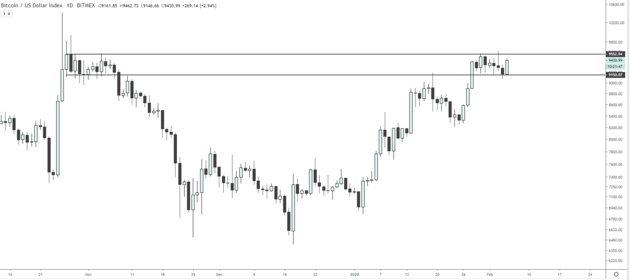 The magic number is to still get above the $9,550s, with a close above there, the price would likely continue upward as there isn’t a lot of resistance before $10k.”