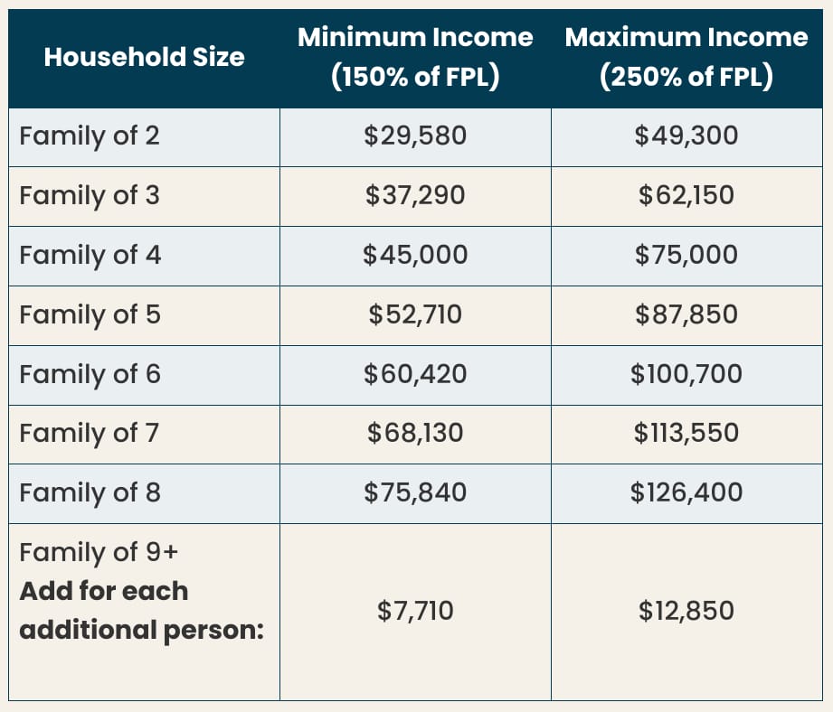 Applicants must be at least 18 years old, have a child who’s 16 years or younger, and maintain a household income that falls between 150% and 250% of the 2023 Federal Poverty Level (FPL).