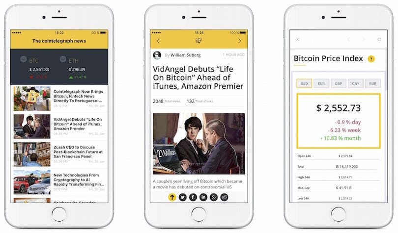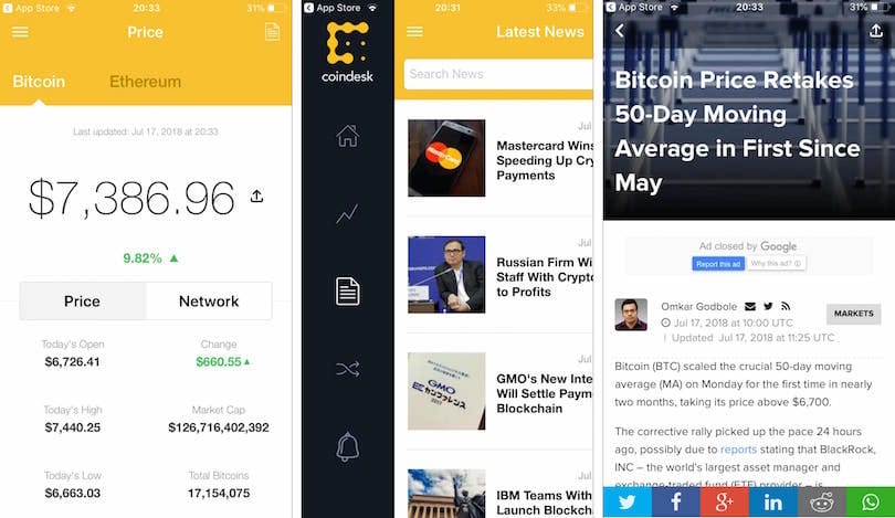 Sample screens from crypto news app, Coindesk.