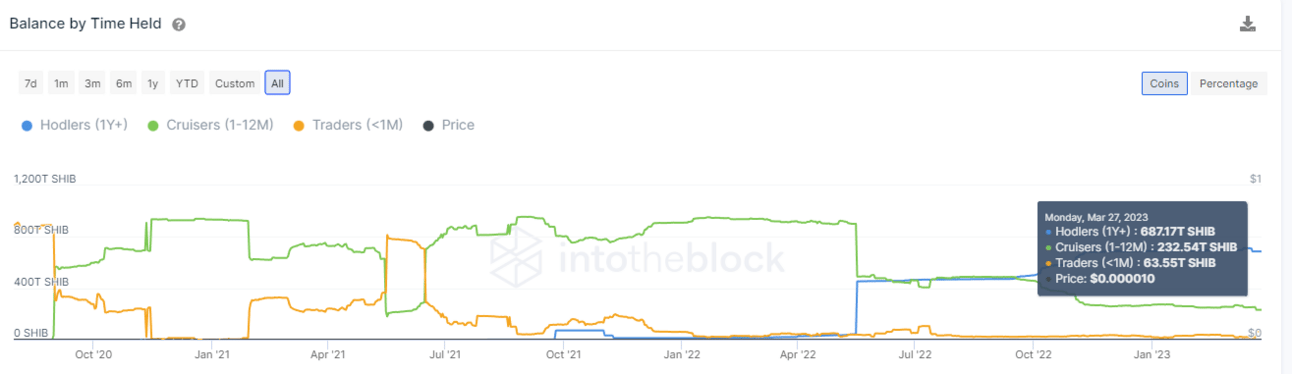 IntoTheBlock shows that hodlers, or entities that have held their SHIB stacks for over a year, collectively own 687,170,000,000,000 SHIB worth over $7.20 billion.