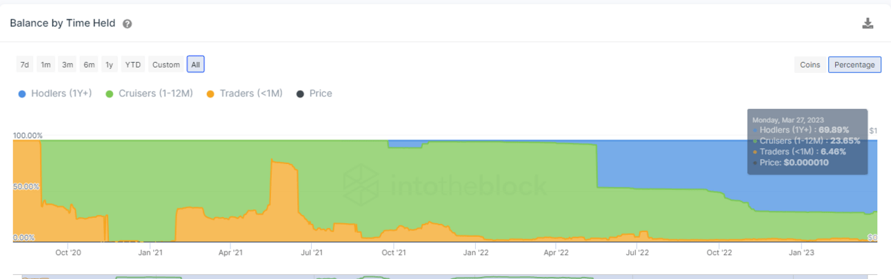 As for traders, or entities who hold their Shiba Inu for less than one month, IntoTheBlock reveals that they currently control 63,550,000,000,000 SHIB to the tune of $666.63 million. Traders also own 6.46% of SHIB’s supply, per the intelligence firm.