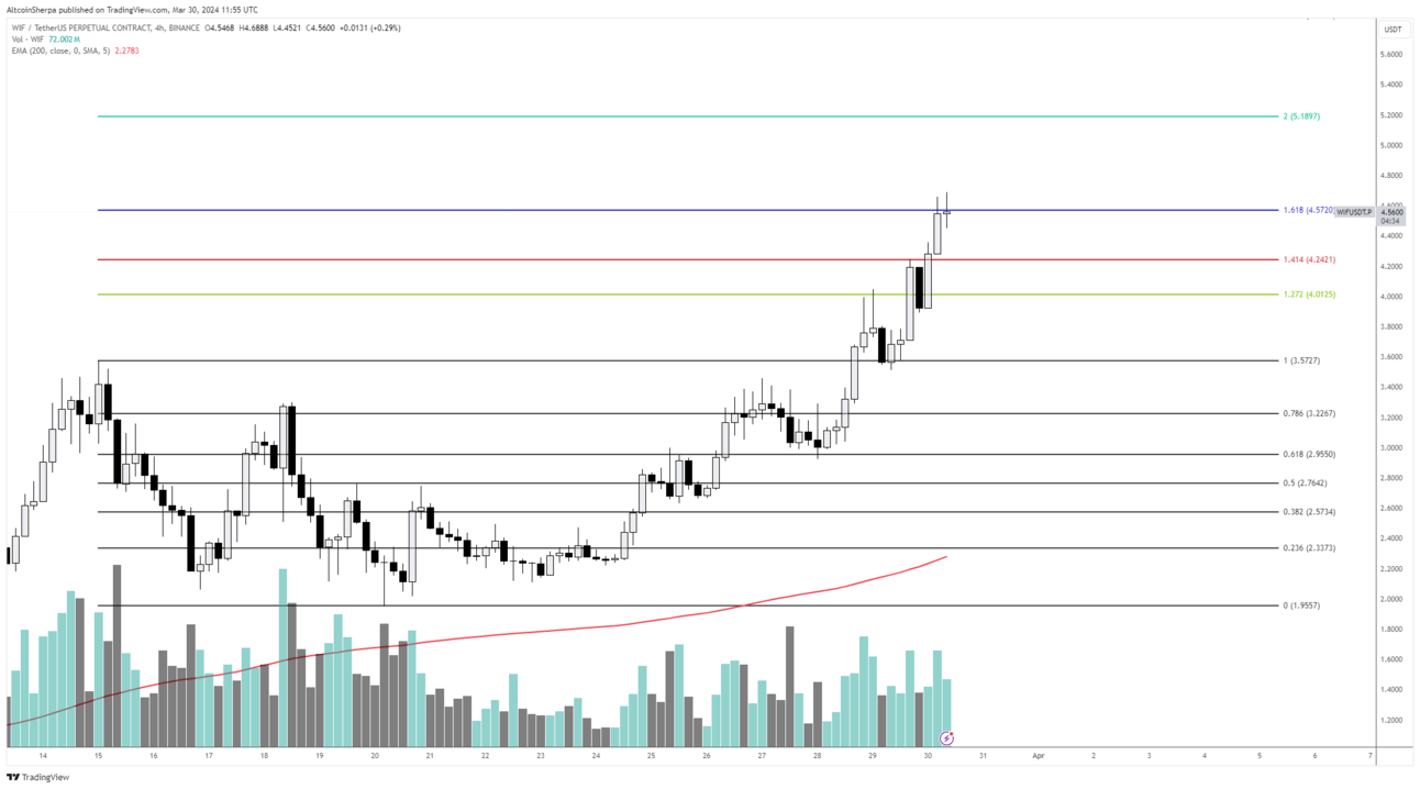 The last memecoin on the trader’s list is dogwifhat (WIF). According to Altcoin Sherpa, he sees WIF rallying to new all-time highs if it takes out the 1.618 Fibonacci level at $4.57.
