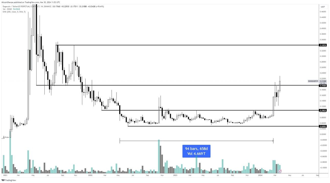 Pseudonymous analyst Altcoin Sherpa tells his 213,200 followers on the social media platform X that he sees top memecoin Dogecoin (DOGE) igniting an over 50% rally from current levels after moving above its resistance at $0.195.
