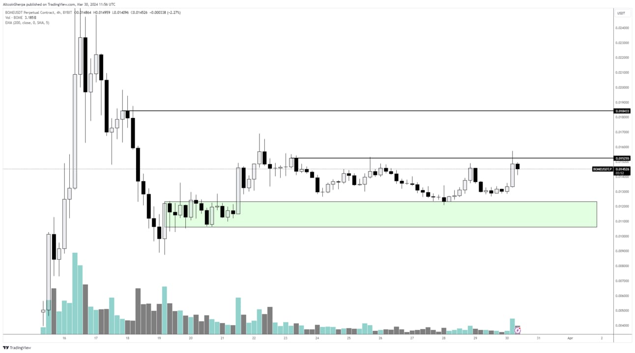 Another coin on the analyst’s radar is the Solana (SOL)-based memecoin BOOK OF MEME (BOME). Altcoin Sherpa says it might take some time but he sees BOME taking out its immediate resistance at $0.0152.