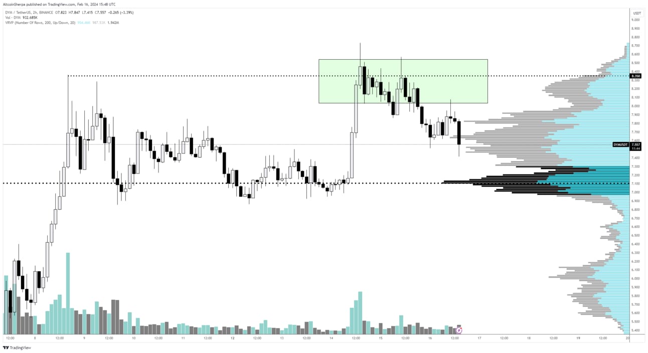 The last coin on the analyst’s radar is Dymension (DYM), a modular blockchain that launched its mainnet earlier this month. Altcoin Sherpa forecasts DYM correcting to the bottom of its current range near the $7 level.
