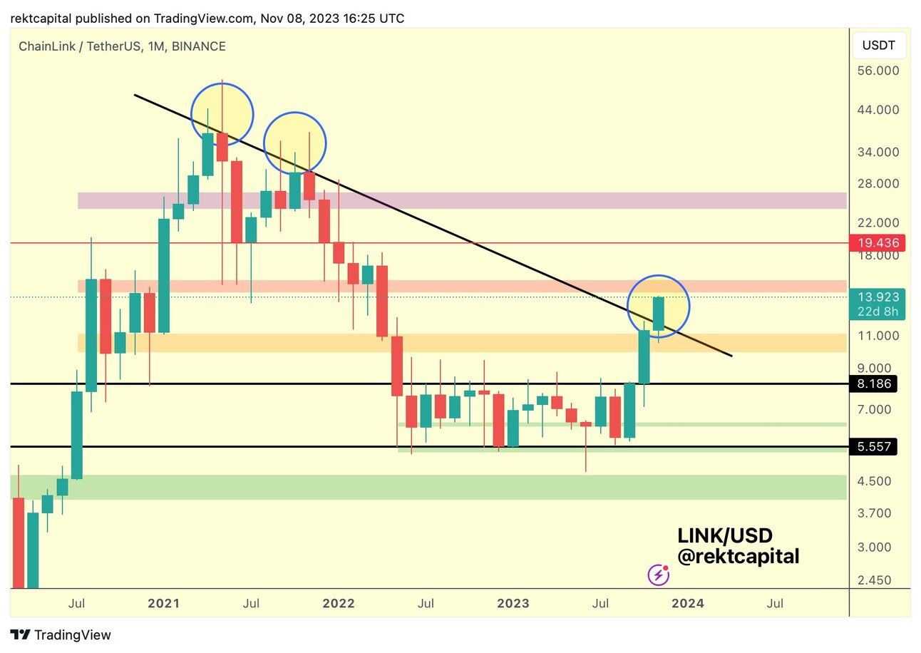 Chainlink is trading for $13.95, up more than 93% in the last 30 days.