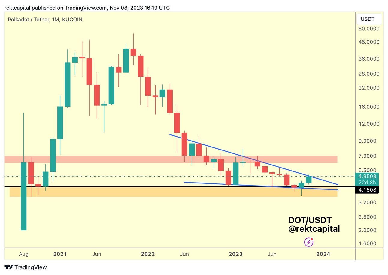 Pseudonymous analyst Rekt Capital tells his 366,100 followers on the social media platform X that Ethereum (ETH) competitor Polkadot (DOT) is potentially in the midst of confirming a bullish reversal.