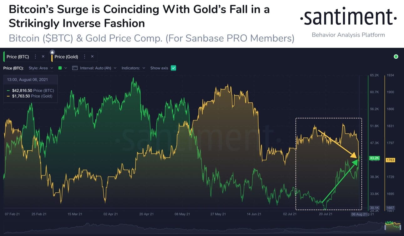 “Bitcoin and gold investors saw very opposite price performances to close out the trading week. BTC surged to above $43,000, as gold has swung downward, seeing its biggest decline since mid-June. The two are very much behaving inversely to one another.”