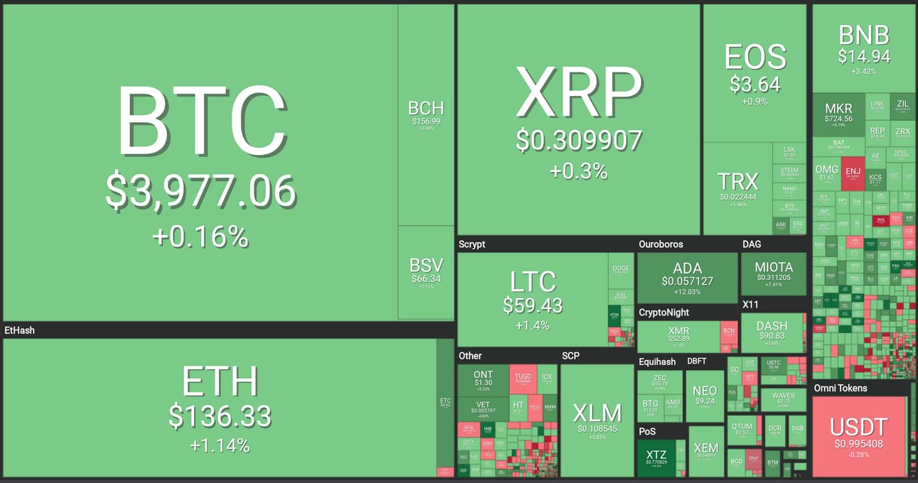 Bitcoin’s quest to remain above $4,000 continues. Right now, BTC is up 0.16% at $3,977. Ethereum is up 1.14% at $136, and XRP is up 0.3% at $0.3099.