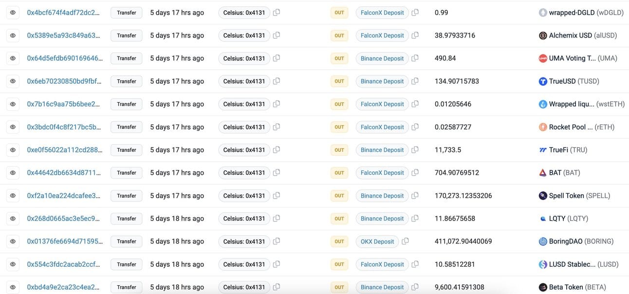 Lookonchain further says that Celsius also moved various tokens to FalconX as well as Binance and OKX crypto exchanges five days ago. The tokens include various stablecoins, the governance token of the Abracadabra DeFi platform Spell (SPELL) and the utility token of the Brave browser Basic Attention Token (BAT).