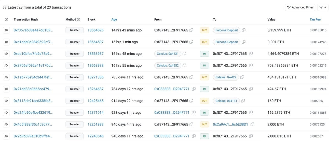 Citing data obtained from blockchain explorer Etherscan, on-chain data tracker Lookonchain says that Celsius moved 5,160 ETH worth approximately $10.49 million to institutional crypto trading platform FalconX.