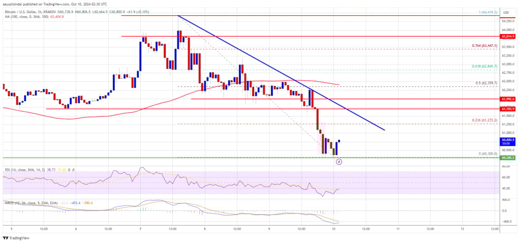 A low was formed at $60,300 and the price is now consolidating losses. There was a minor increase above the $60,550 level. However, the price is still well below the 23.6% Fib retracement level of the recent decline from the $64,420 swing high to the $60,300 low.