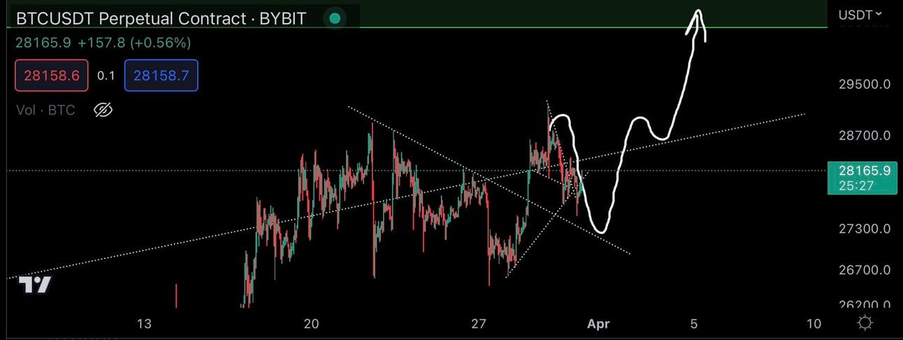 Kaleo’s chart indicates he is predicting Bitcoin will hit $30,000 by April 5.