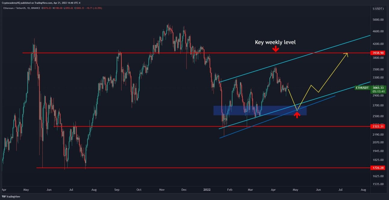 As the trader’s chart depicts, Bennett predicts ETH will crash to the $2,500-$2,700 range before rocketing back to previous all-time highs and beyond.