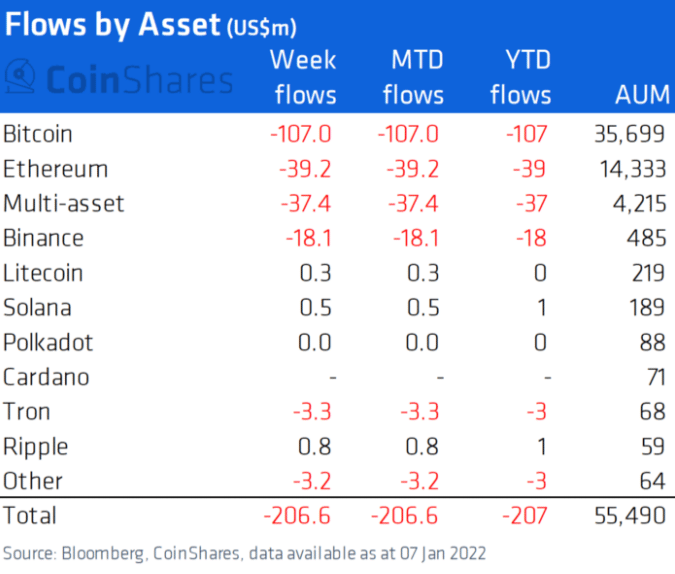 Leading smart contract platform Ethereum (ETH) also saw significant outflows, continuing a down streak that began in December.