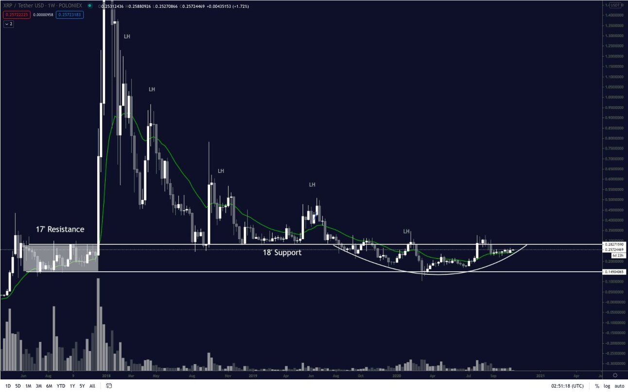 “XRP It’s bull run starts above .30-.33c 17′ resistance. 18′ support. Rounding off on the weekly. Just not quite there yet though. Maybe in a week or two it can close above BTC allowing. But for now it’s lagging.”