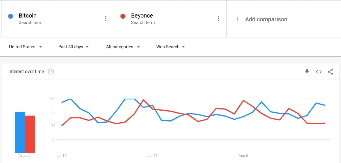 The popular Bitcoin vs. Beyoncé comparison currently shows Bitcoin on top, although the two search terms have traded places multiple times in the last month.