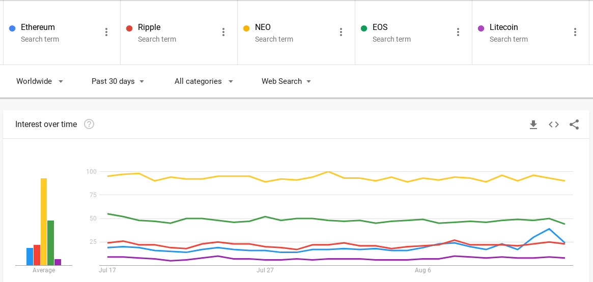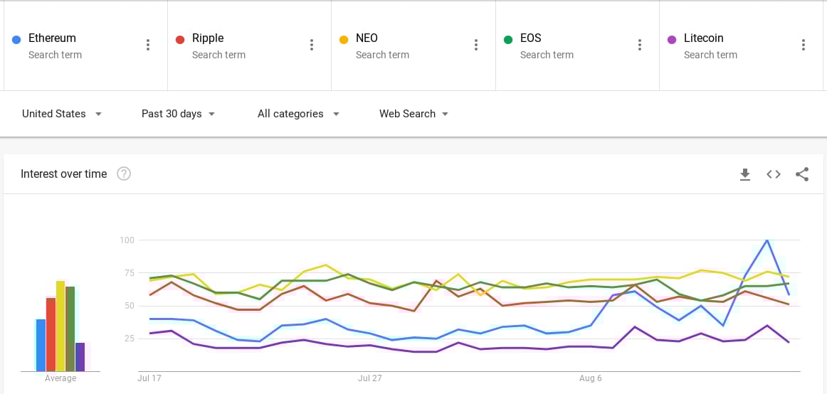 As for the altcoins, here’s a look at the top web searches over the past 30 days in the US, including Ethereum, Ripple, NEO, EOS and Litecoin.