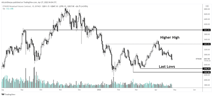 “ETH: Unlike BTC, ETH is still decently above its last lows and still has a bullish market structure (BTC does too but its closer). Would like to see a higher low formed for Ethereum. I think that it’s still at the mercy of BTC though, as always- if BTC tanks, so will ETH.”