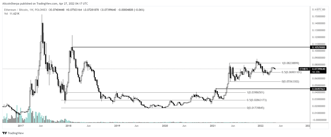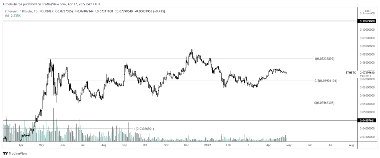 In the case of the Ethereum/Bitcoin pair, the crypto trader predicts that ETH/BTC is likely to continue to range for weeks at the minimum.