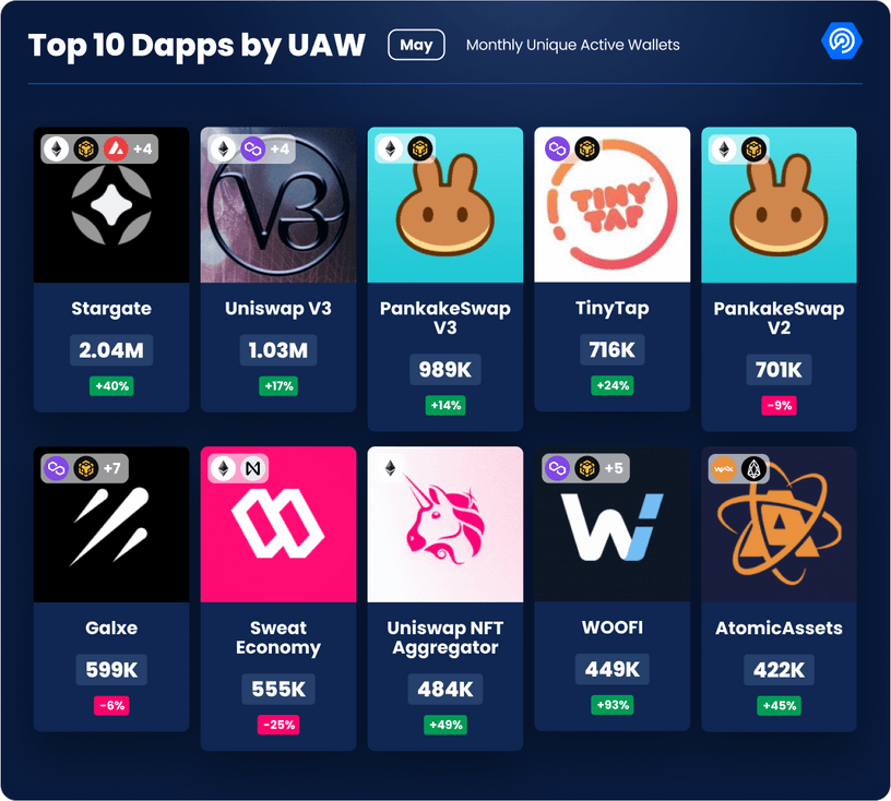 Stargate registered 2.04 million UAWs in May, a number DappRadar refers to as “staggering.”