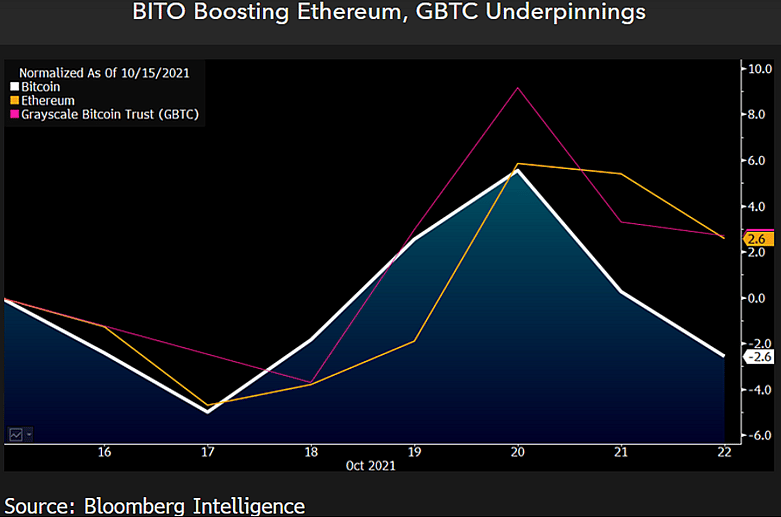 “Strong inflows for the new ProShares Bitcoin Strategy (BITO) ETF show pent-up demand and quantitative traders targeting arbitrage opportunities, which are likely to narrow spreads and pressure volatility.