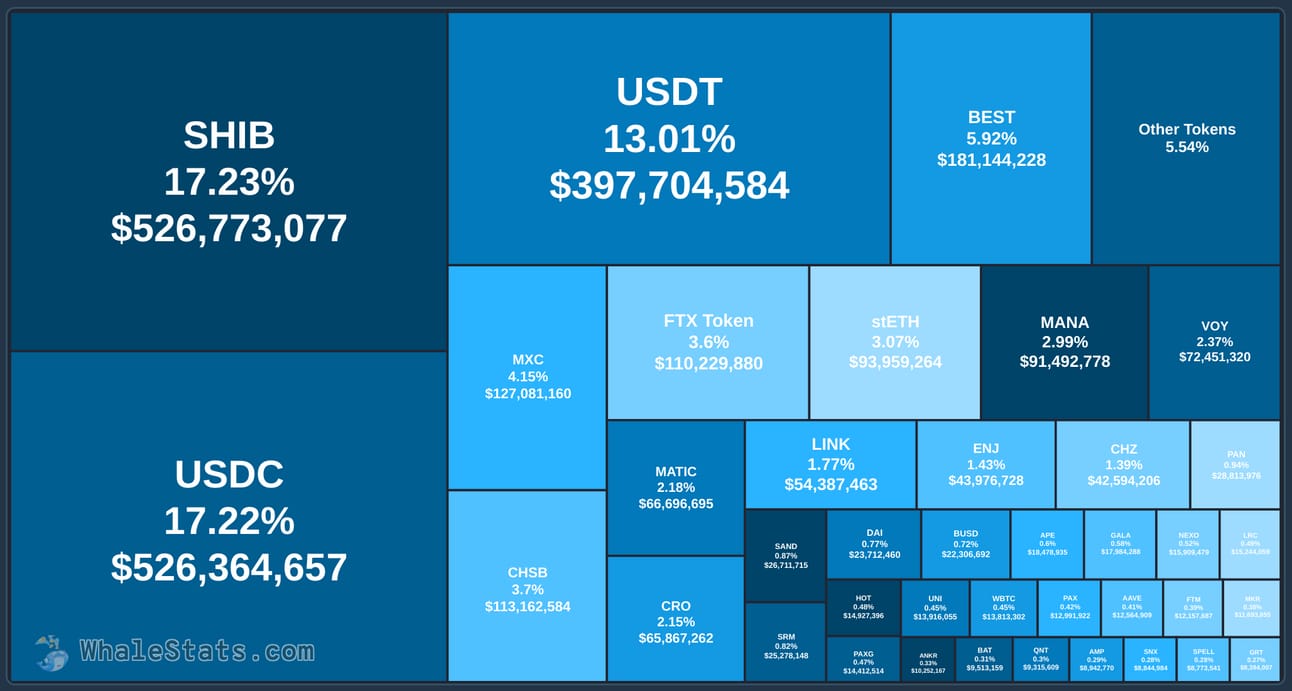 Other prominent tokens held by the whales include MXC, which enables Internet of Things tokens to be swapped through non-fungible token (NFT) marketplaces, FTX Token (FTT), the native asset of the FTX crypto exchange, cross-crypto exchange app SwissBorg (CHSB), and gaming metaverse Decentraland (MANA).