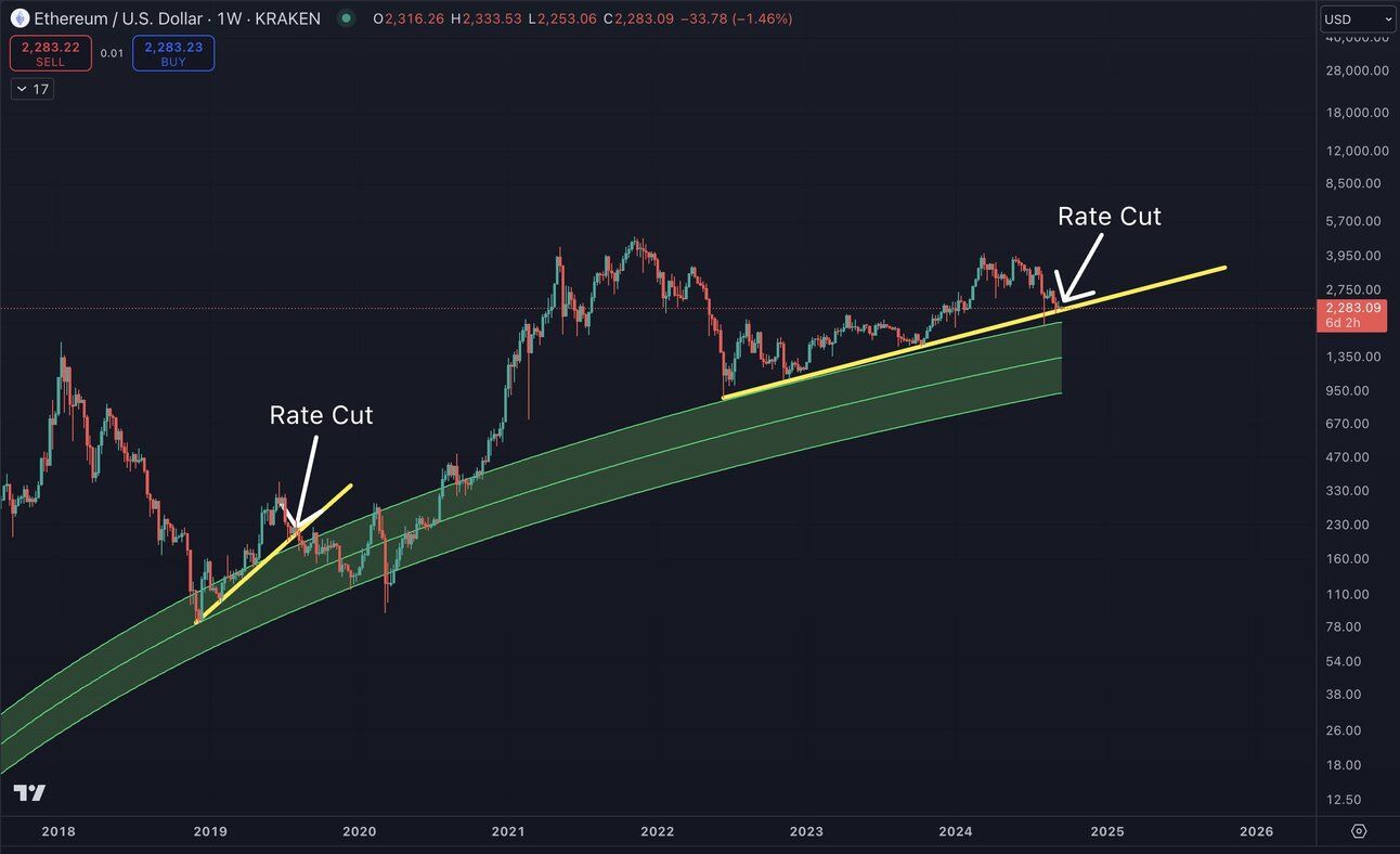 “While ETH/BTC bottomed shortly after the 1st rate cut in 2019, ETH/USD trended down until [end of year].”