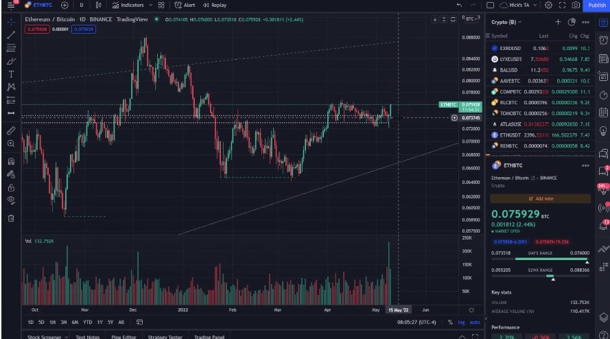 “Taking a look here at the ETH/BTC ratio, the absolute reversal we’ve seen here over the past few hours where we’ve been seeing the ratio picking up and almost getting back to the highs here, the highest level we’ve seen since January. This, especially with the volume kick-up we had here on Binance yesterday is absolutely fascinating and one which cannot be ignored.