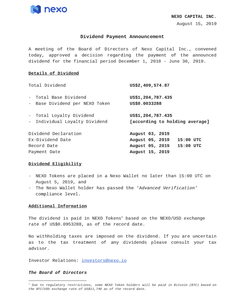 The post NEXO Token Holders Receive $2,409,574.87 in Dividends appeared first on The Daily Hodl.