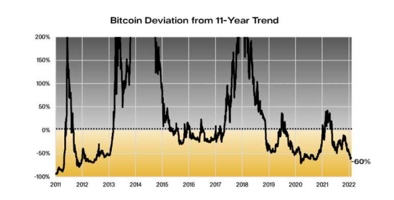“It shows where Bitcoin, as a proxy for our industry, is in relation to its 11-year log trend. It’s now trading 60% below trend…