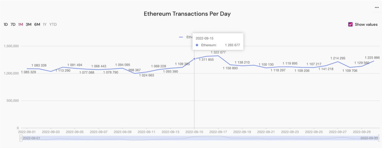 The highest average number of transactions in September was made on the 15th, 16th and 17th, with a peak of 1,322,077 transactions. Such activity is associated with the transition of Ethereum to the proof-of-stake system and the activity of traders.