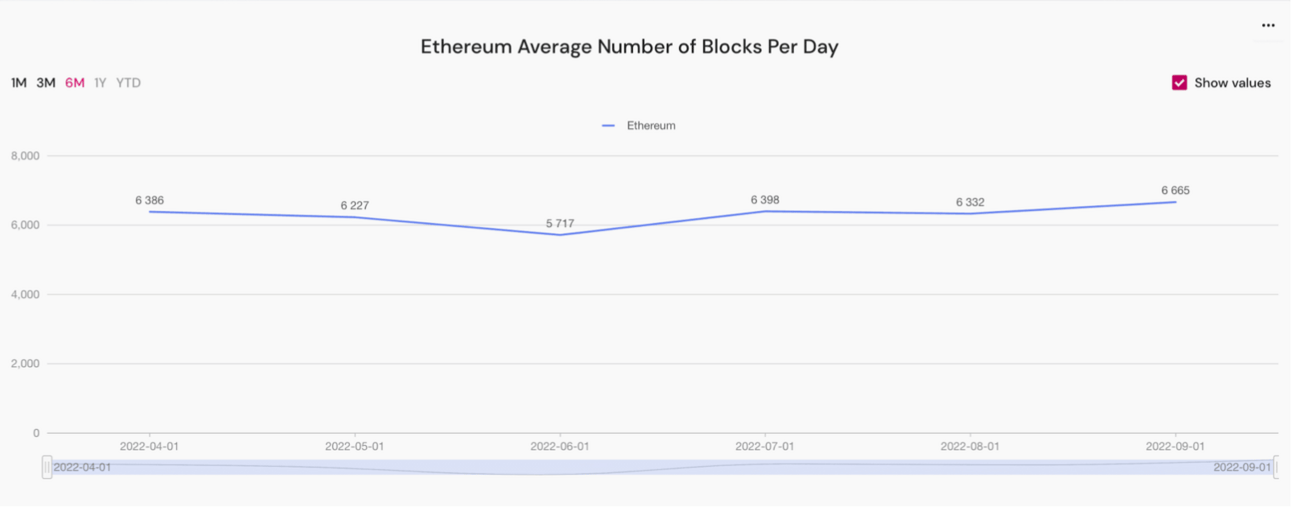 In September, the “Ethereum average number of blocks per day” chart shows an increase of 5.3% in the average number of blocks per day. The average number of Ethereum blocks per day in August was 6,332, and the average number of Ethereum blocks in September was 6,665.