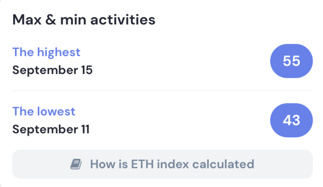 Ethereum activity index shows the activity of users on the Ethereum (ETH) network. It is calculated automatically based on a combination of several factors, such as active wallets on the network, gas used and transaction statistics.