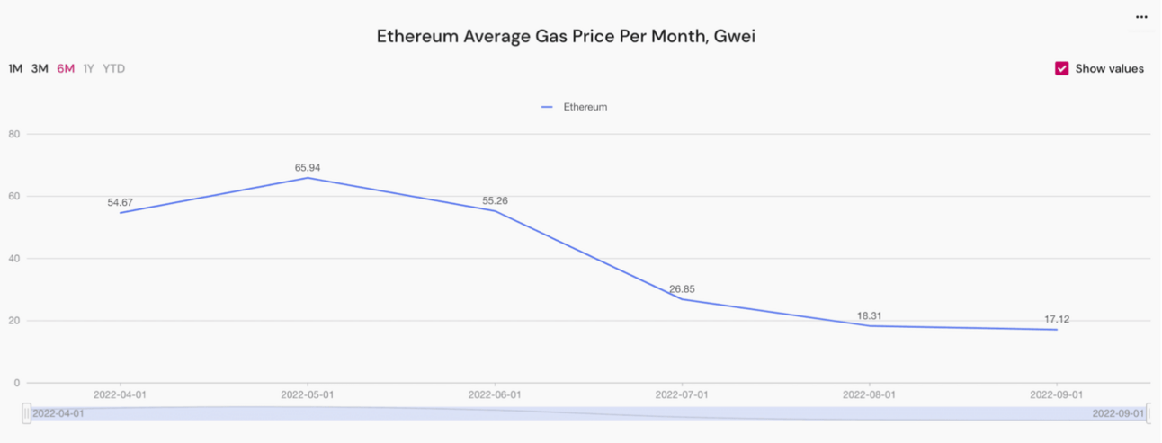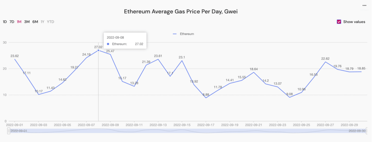 In September, the average Ethereum gas price was 17.12 gwei. In August, it was 18.31 gwei. The gas price decreased by seven percent.