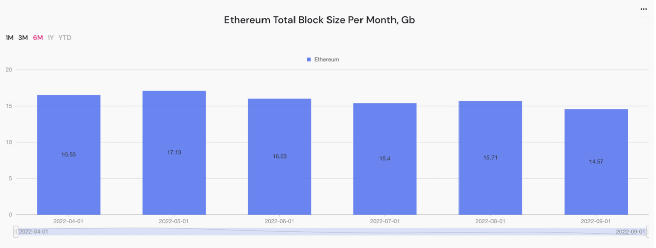 The “ETH total block size per month” Gb chart shows that the total block size in September was 14.6 Gb, and in August, it was 15.7 Gb. The value has decreased by 7.8%.