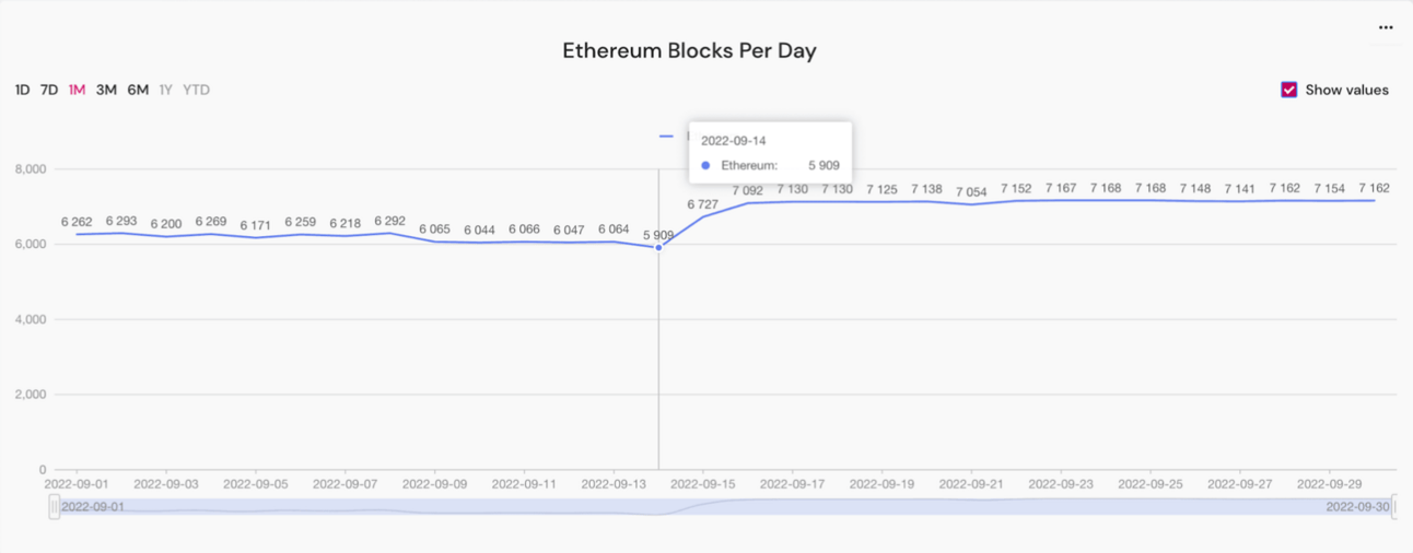 At the same time, the number of blocks per day increased significantly on September 15, 2022, after the transition of Ethereum to the proof-of-stake system. This can be clearly seen in the chart below.