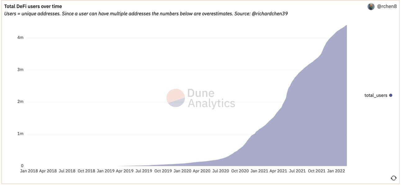 “Total DeFi addresses are at 4.4 million, up 203% from year-ago date.”