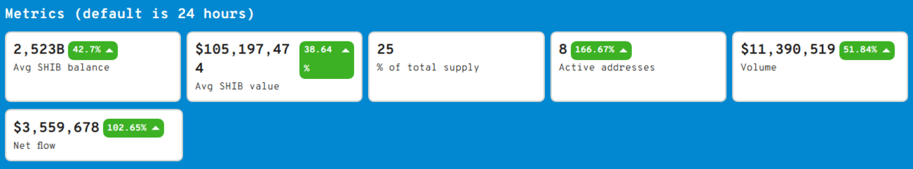 Whale-tracking platform WhaleStats reports that of the top 100 Ethereum wallets holding SHIB, the average balance increased by a whopping 42.7% to 2.523 billion in the past 24 hours alone.