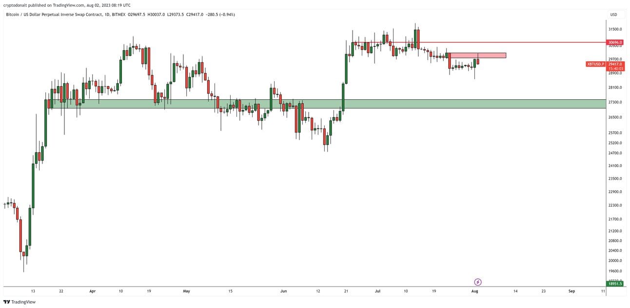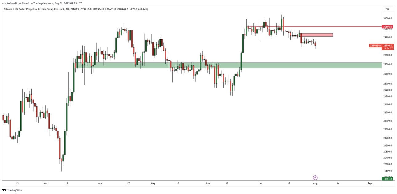 For now, DonAlt believes that Bitcoin’s recent price action indicates BTC will likely see more downside moves after retesting $29,000 as resistance.