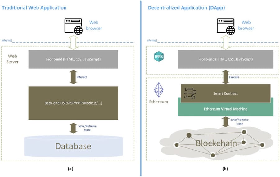 The main difference from the applications that we are accustomed to is the DApp’s backend code. In centralized applications, the backend code runs on a server that is controlled by a third party and interacts with the front end via JSON messages over HTTP.